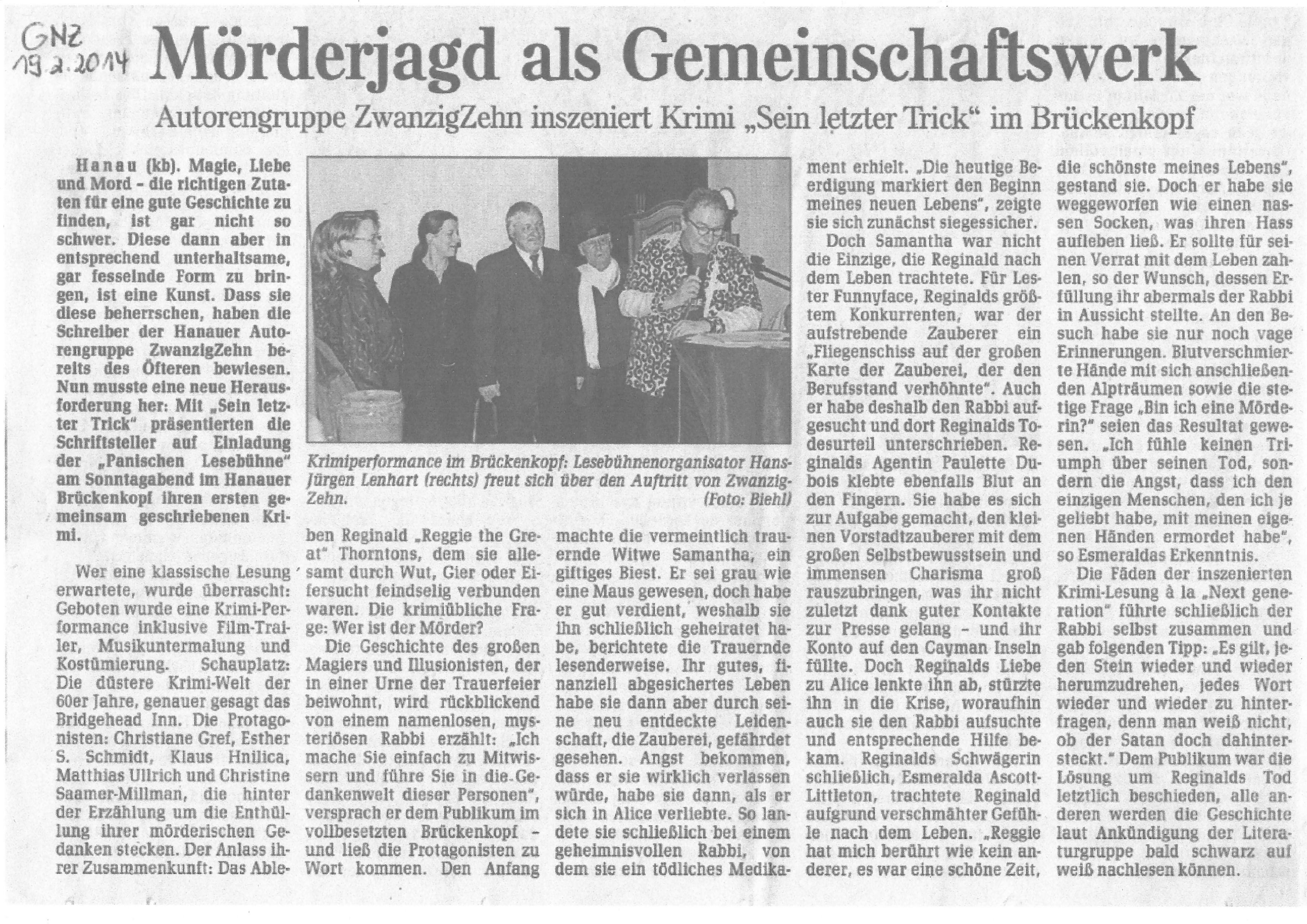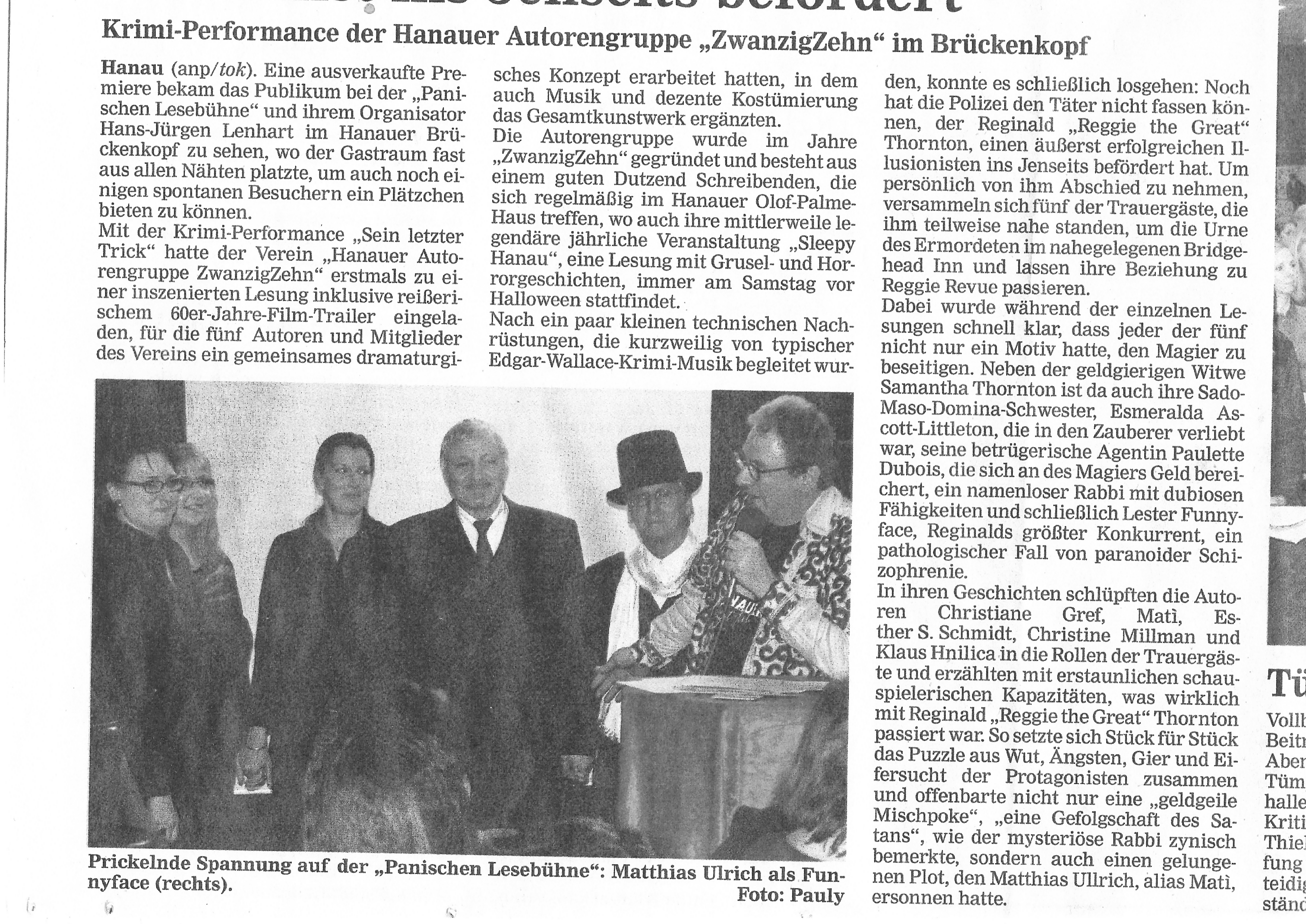 Berichte Presse 2014 VonSaithum 4. März 202217. Mai 2025 Im Februar 2014 kam es zur Premiere der Krimistücks „Sein letzter Trick“ im Brückenkopf in Hanau. Die Presseberichte reichten bis nach Gelnhausen.